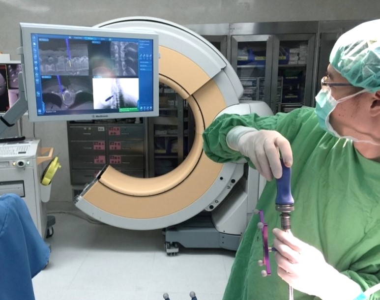 - MIS-TLIF (Minimally Invasive Transforaminal Lumbar Interbody Fusion): Two small incisions are made in the lower back under navigation guidance. Muscles are gently separated, rather than cut. The facet joint is removed to decompress nerves and access the spine. The damaged disc is removed, and a fusion cage with bone graft is inserted. Pedicle screws and rods are placed through the same small incisions to stabilize the spine, guided by computer navigation and intraoperative imaging.
